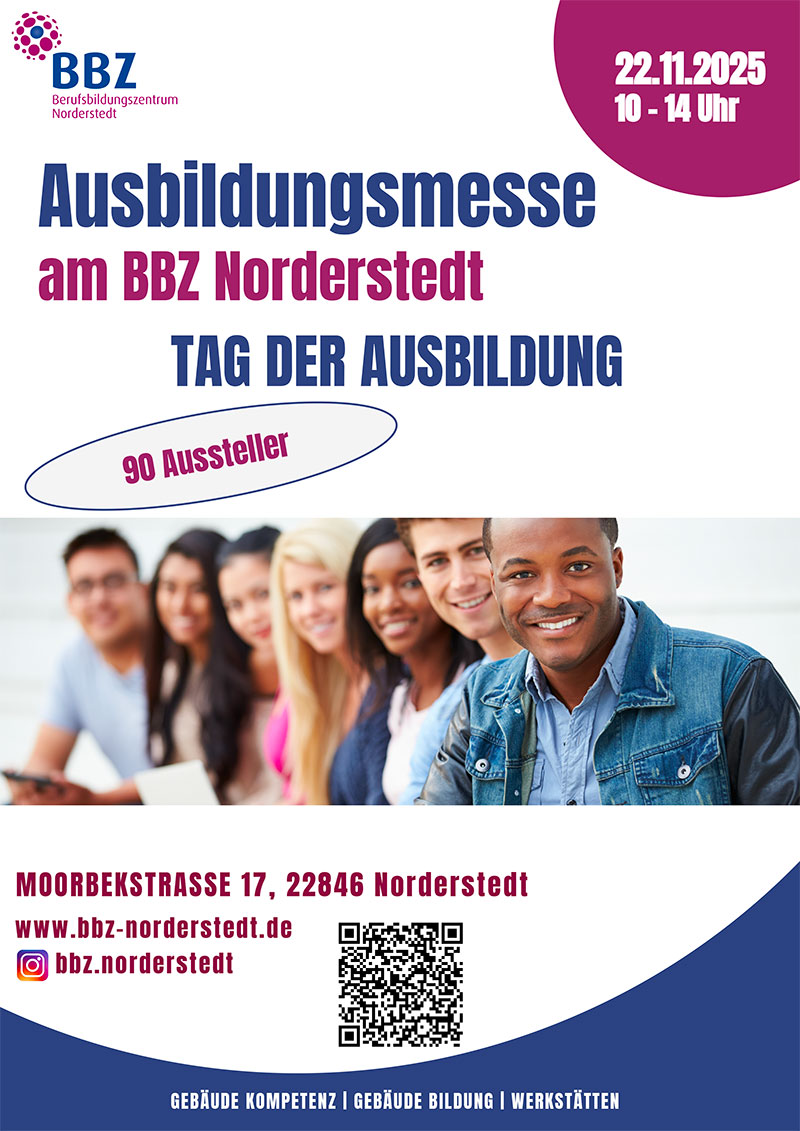 Komm' zur Ausbildungsmesse am 22.11.2025 ins BBZ Norderstedt und lerne uns und zahlreiche weitere Ausbildungsberufe aus der Nähe kennen!